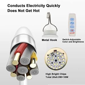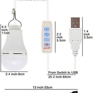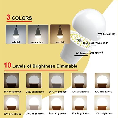 Can be connected to solar power bank, computers, power station and adapters Can be connected to any power supply with USB interface.Easy to use and carry, is a must-have item for camping, emergency lighting, stallHook bulb, you can hang it anywhere you wantControlled by an on-off button, warm light, cold light, natural light can be adjusted, and 1-10 different levels of brightness can be adjusted, which can meet your lighting requirements for different places.
