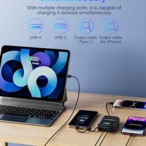Portable charger is designed with 4 outputs: 1 USB-A port(SCP22.5W), 1 Type-C port (PD30W), 1 IOS charging cable and 1 Type-C charging cable (SCP22.5W). Portable charger is also equipped with 2 inputs: USB-A port and Type-C port.