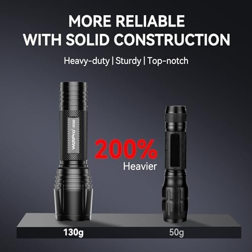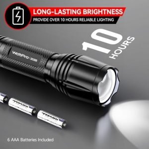 Bright & Powerful: Light up any dark area with upgraded LED chips, proving you surprised brightness.Compact & Convenient: At 5.12 x 1.46 x 1.08 inches, the flash light is compact enough to fit in your pocket or backpack, convenient for you to carry everywhere.Weatherproof & Reliable: WdtPro flashlights have proven to be reliable under extreme weather conditions with IP65 high water-resistant level. Ideal choice for outside using like camping, hiking, night walking, etc. Made of military grade aluminum, feels heavy-duty!Easy to Control: 5 lighting settings are controlled by 1 key that also the on/off button. Easy to turn off the flashlight at any mode.Special handle design, can be hold tightly or stand on-end as an emergency light. Very handy tactical flashlight.6 AAA Batteries Included: Your extra values with battery pack so that you can use the tactical flashlight instantly.
