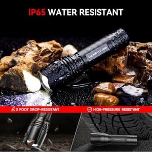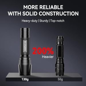 Reliable with Great Quality: The tactical flashlight constructed from military-grade aluminum, feels super sturdy and heavy-duty with weight 130g that heavier than the similar flashlights on market. The flashlight high lumens is water-resistant and strong enough to withstand a 10-foot drop and rough handling. Anti-roll head plus anti-slip texture prevent the flash light from dropping from your hands and thus ensure its longevity.