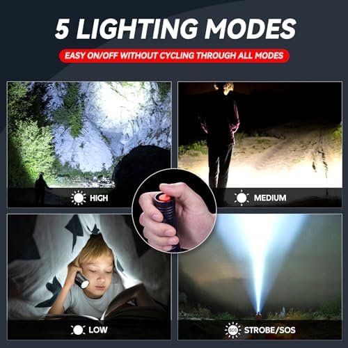Compact with Perfect Size: Measuring length 5.12 inch, diameter 1.3 inch, the small flashlight can hold easily and comfortably. It fits well in your pocket, backpack, purse or car glove compartment. Very convenient to store, easy to carry and handy to use. Great Xmas stocking stuffers for guys or gals. Brightest flashlight for camping, emergency, dog walking, or hiking and every day use.