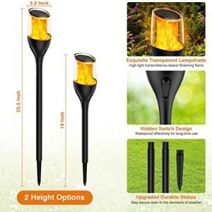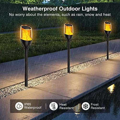 FLICKERING FLAME TORCH LGHTS: 2023 newly upgraded version! These solar outdoor lights are aesthetically pleasing with particular modern design and dancing flickering flame inside the glass-like lampshades. The solar torch lights inspired from the real “flames” cast a lovely gentle glow and flickers like flame, creating a fabulous ambience. Thus give you a bright but warm feel. Perfect outdoor decorations for yard garden lawn patio pathway, etc.