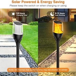 SOLAR POWERED OUTDOOR LIGHTS: Equipped with bright 2835 type LEDs, high efficiency solar panel and 800mAh high capacity battery, the solar tiki torches can stay lit 8-12 hours of continuous light in summer and 4-6 hours in winter or in cloudy after fully charged, providing a cool flickering effect with enough brightness. Solar powered pathway lights also mean energy-saving and then save your money. If any item fails to light up within 1-year, please reach out to us for a brand new replacement!