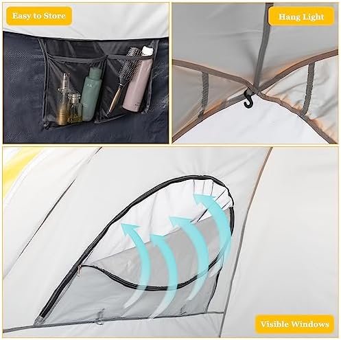 【Humanized Design】 The tent is equipped with 4 mesh pockets, which are convenient for storing your mobile phone, glasses, wallet, keys, etc., and keep the internal space clean. A hook is designed on the top of the tent for hanging lights, camping anytime, anywhere.