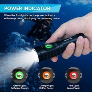 3 LIGHTING MODES DIVE TORCH: The dive light has 3 light modes(High-Low-SOS). Just press the button to switch different brightness to meet your different underwater lighting needs. Battery indicator light to remind of remaining battery power: Green light (over 30%), the red light (10% ~ 30%), and the red light flashing (less than 10%).