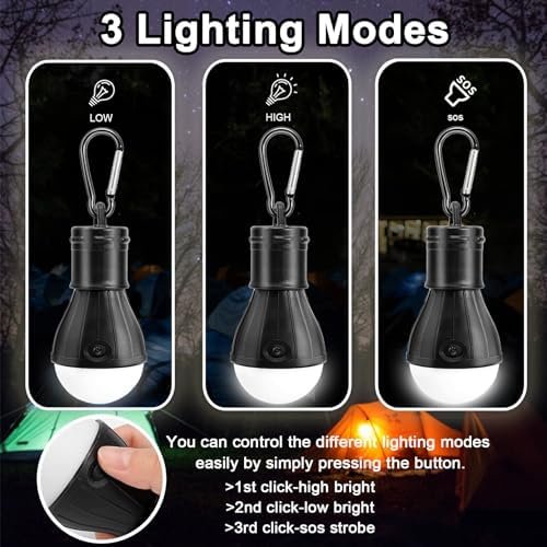💡3 Lighting Modes: The portable camp light bulb has 3 lighting modes, high light, low light and SOS flash mode. The operation is simple, just press the round button to switch the appropriate mode according to different types of activities.